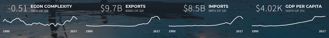 Zambia is the 83rd largest export economy in the world and the 78th most complex economy according to the Economic Complexity Index (ECI). In 2017, Zambia exported $9.7B and imported $8.5B, resulting in a positive trade balance of $1.21B. In 2017 the GDP of Zambia was $25.9B and its GDP per capita was $4.02k.